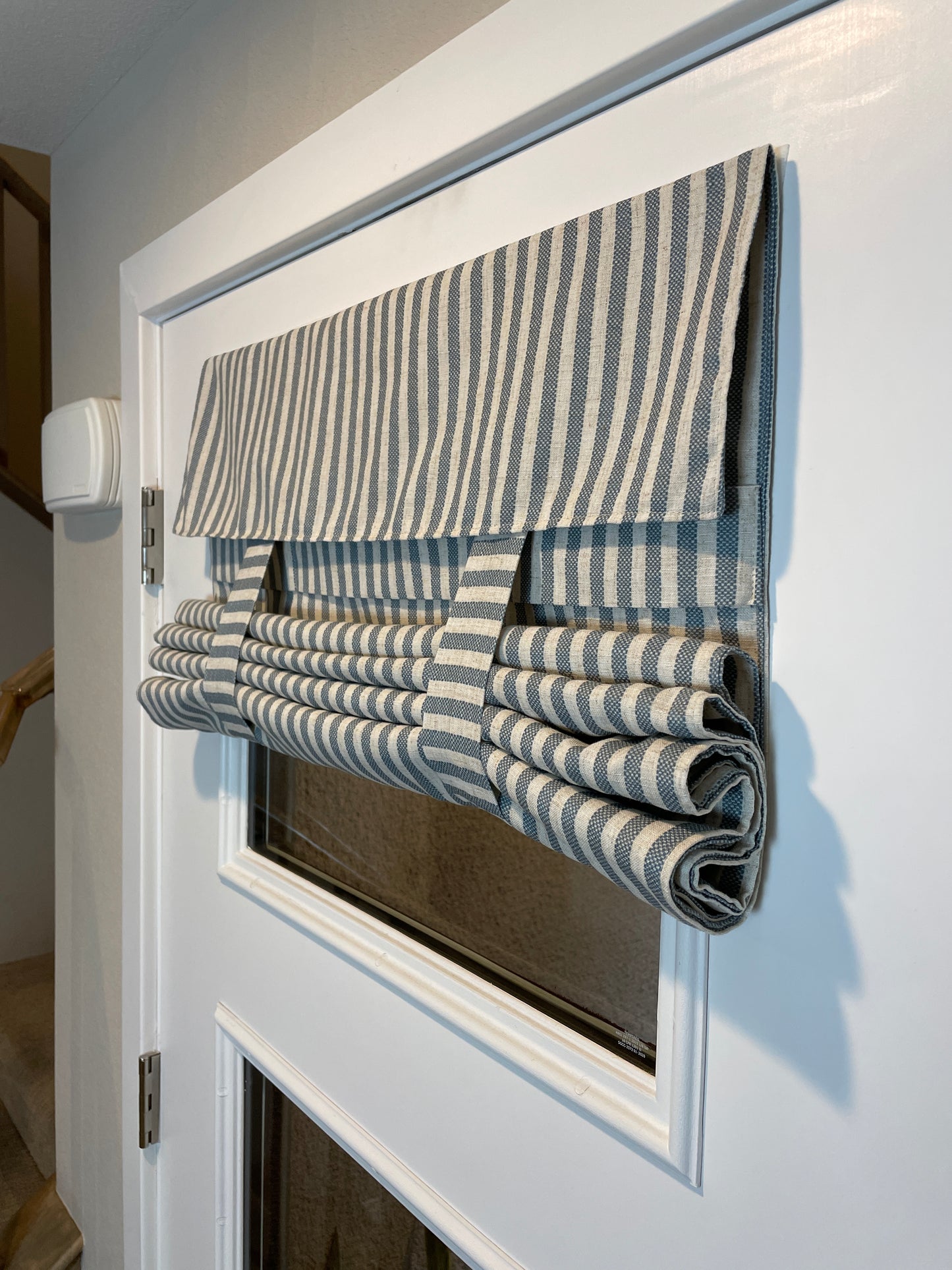Fabric Description and Content: This Morning Blue Striped Fabric is a medium weight and very soft. The background color is a beige, creamy oatmeal color and the stripe is a morning blue color (not navy, not light blue). This fabric allows a lot of light through, but still gives full privacy, even at night. Made from 15% Linen 85% Polyester.