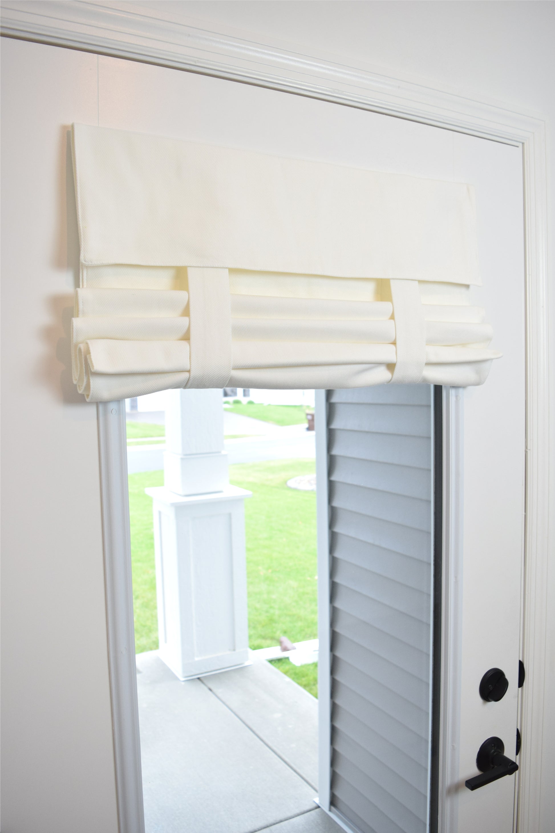 - For curtains over 79" long, we recommend a drop-down style curtain for ease in reaching the straps. This curtain has a 10" valance: curtain hangs to 26" when in the folded-up position. (This extra-long style must be specifically requested when ordering, otherwise we will do a 7" valance. Or you can order from our Drop-Down Extra Long French Door Curtain listing.)